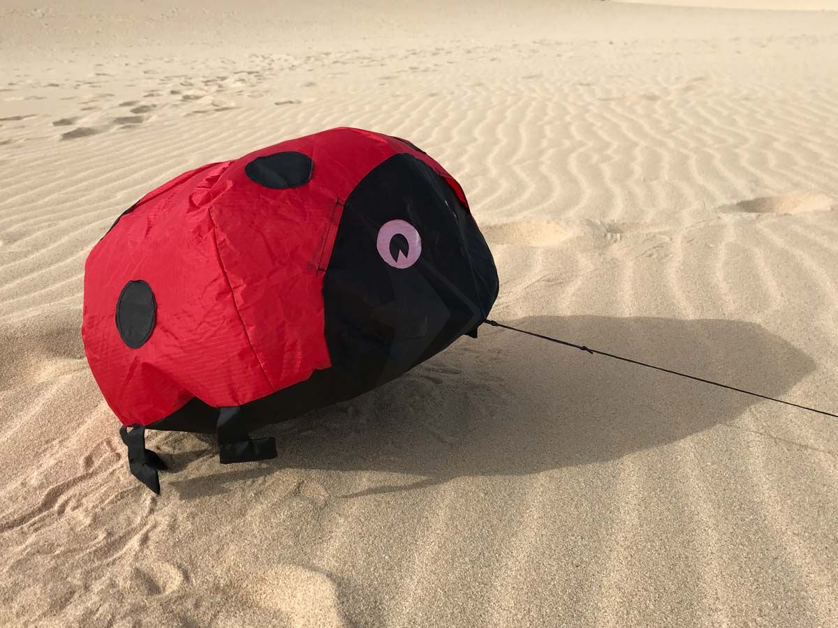 Herlig dansende mariehøner ca 40 cm. Fastgøres til pløk (medfølger ikke) og stilles i vinden, så danser den. Der skal være gode, "flade" vindforhold. I en have med hæk, træer og turbulent vind dur det ikke. Det skal være på et åbent areal, strand, park, stor plæne eller lign. Vind: fra 6 m/s. Gerne 8-10 m/s.
